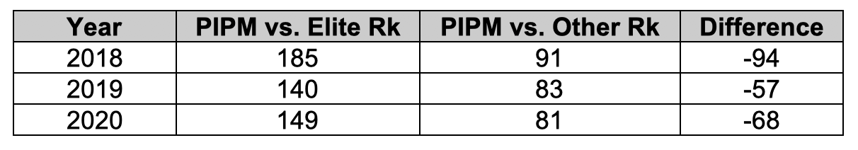 At the start of the 2020-21 season, fortunately for Jacob, but unfortunately for those of us who liked using PIPM in the public domain, he was hired by the Washington Wizards and PIPM went dark. Since then, I’ve wanted to recreate the metric for my own personal use, but I didn’t want to just do exactly what Jacob did, because well, that doesn’t feel very inspired and I thought there were some additional tweaks I could make to the process to maybe improve it. In broad strokes, however, the two metrics could be considered siblings or at the very least first cousins. They have very similar DNA.