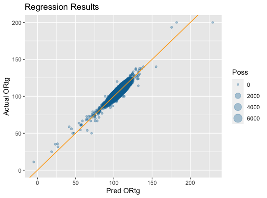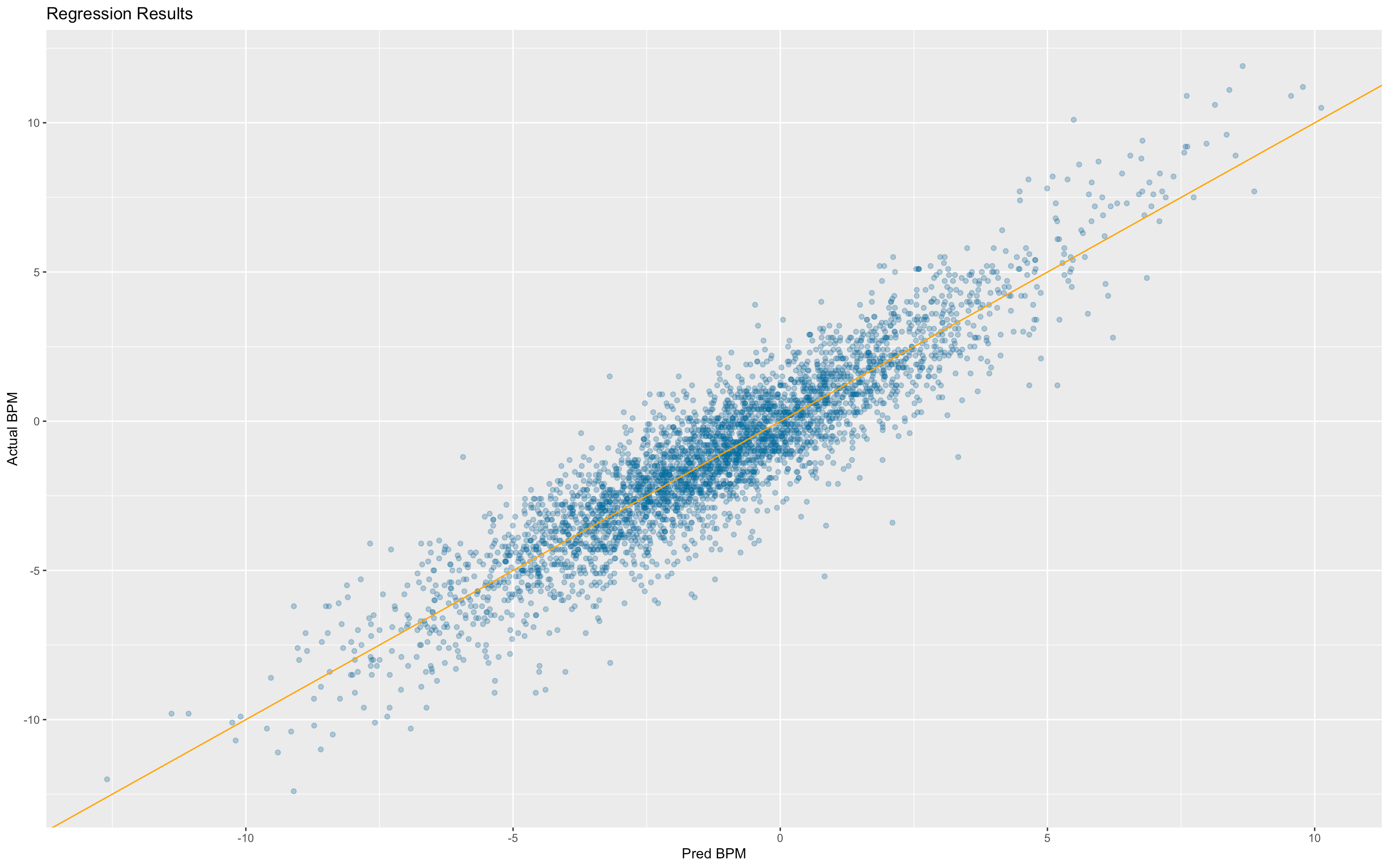 The r-squared for this regression on the testing set was .84 with a mean average error (“MAE”) of only .92 points per 100 possessions on the BPM scale. So it is a very strong proxy for actual BPM, with very simple inputs and is generally very close to the real deal. Here is what that looks like in a plot of the predicted versus actual data points on the training set.
