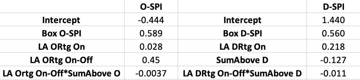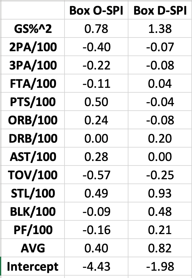 The box-score coefficients for SPI are as follows: