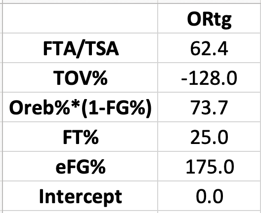 Here are the weights for predicting Offensive or Opponent Offensive Rating based on this regression: