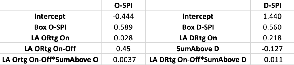 These coefficients for SPI were also produced using regression with 10×10 cross validation and the r-squared for O-SPI to 26 year O-RAPM is .80 and for D-SPI to 26 year D-RAPM is .74.
