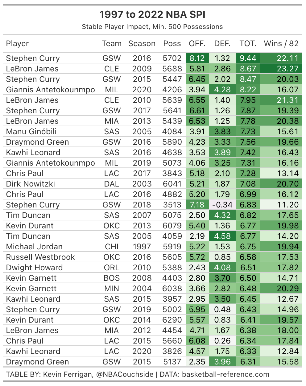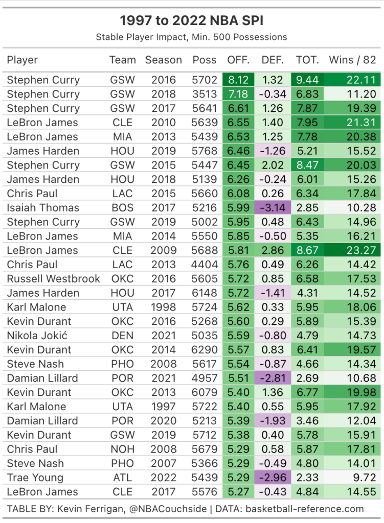 Here are the top 30 seasons in Stable Player Impact of the play-by-play era (1996-97 to 2021-22 seasons):