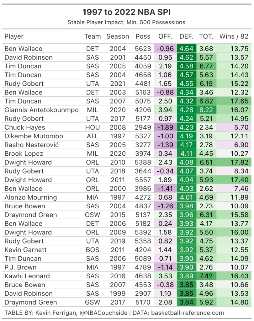 Lastly, we have the top defensive SPI seasons of the last 26 years: