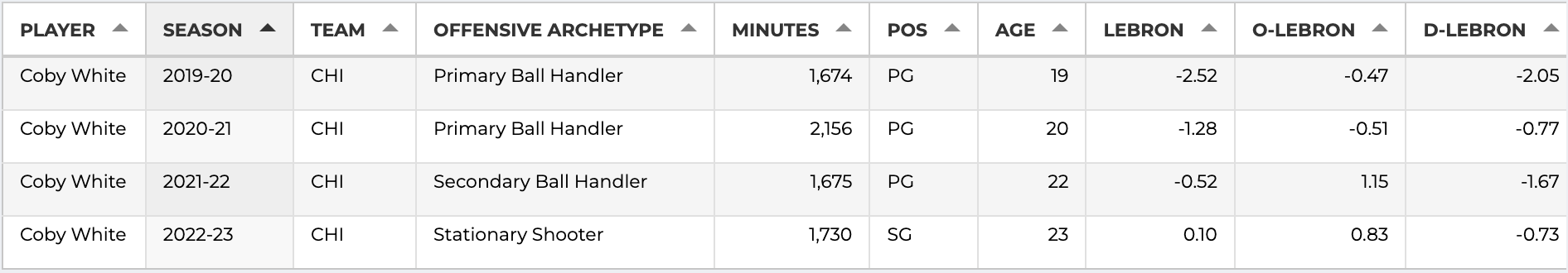 Let me start by saying that I really like Coby White. In fact, I think the Bulls absolutely should bring Coby back this summer as a restricted free agent, because he is a good young player on a team with not enough of them. In addition, he plays an entertaining brand of basketball, appears to be beloved by his teammates, and he did improve in a fairly major way this season. To look at just one publicly available All-In-One metric, Bball-Index’s LEBRON, you can clearly see that this was Coby’s best season of his career and the first year that he was a positive impact player in his minutes: